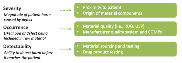 A thorough risk management strategy will assess material suitability based on multiple aspects using a methodical approach. A common method for risk assessment of raw material suitability is to perform a failure modes and effects analysis (FMEA). The FMEA identifies critical information for each material and assigns a severity, occurrence, and detectability score, which are multiplied to yield an overall risk priority number. Materials with higher risk priority numbers should have mitigations applied first. Importantly, elements of a raw material suitability risk assessment are often directly included within a regulatory submission.