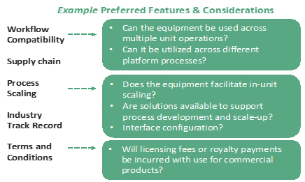 Additional CMC considerations can be evaluated as program-specific attributes or “preferred features” that may be weighted most heavily in the final selection. These features are key drivers in selection to enable forward compatibility into later stages of development. Example preferred features are shown in Figure 2.