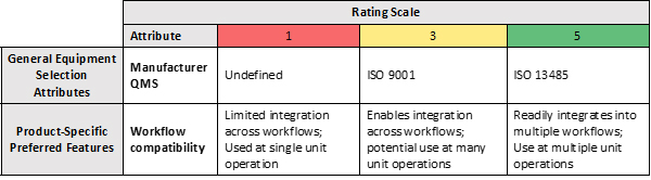 The second component of the decision matrix, qualitative assessment, can be applied to a subset of key attributes using a numerical rating scale. For each attribute included the criteria for conditions that represent “good, better, best” scenarios should be defined. A score is applied to each attribute, and an overall score is calculated across each equipment option being evaluated. Generally, a higher score is considered more favorable. An example quantitative assessment is shown in Figure 3. Additional attributes to consider include technical support, supply chain, scalability, and others.