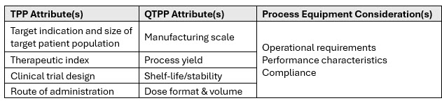 In early development the chemistry, manufacturing, and control (CMC) strategy should be built upon current product understanding. Thus, the first step of an equipment selection process should include consultation of your target product profile (TPP) and quality target product profile (QTPP)2 to identify relevant drug product attributes that inform process equipment selection. An illustrative example of how to apply these two key tools to CMC development strategy is provided in Table 1. In the example provided, relevant TPP drug product (DP) attributes inform quality attributes described in the QTPP. Together, the TPP and QTPP attributes guide an assessment of suitability in process equipment decision-making.