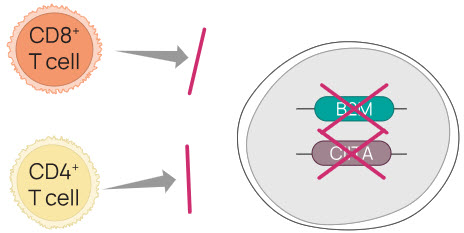 Figure 2. Knocking out cell surface expression of HLA I and HLA II eliminates the T cell response, although other gene edits are needed to avoid innate immune responses. To eliminate cell surface expression of HLA I and HLA II we created a homozygous double knock-out of the B2M and CIITA genes in a hiPSC line.