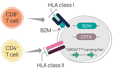 Figure 2. Knocking out cell surface expression of HLA I and HLA II eliminates the T cell response, although other gene edits are needed to avoid innate immune responses. To eliminate cell surface expression of HLA I and HLA II we created a homozygous double knock-out of the B2M and CIITA genes in a hiPSC line containing a TARGATT landing pad.