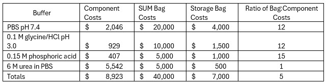 This allows us to compare the costs of buffer components for our unit operation with the cost of single-use bags in Table 3.