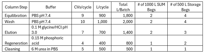 Assuming that our solutions are prepared in a 1,000 L single-use mixer (SUM), the buffer bill for our unit operation is described below in Table 2.
