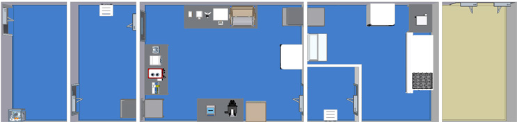 This 5 module facility has the following flow: CNC entryroom, grade D locker room, grade C gowning and material storage connected to a grade C supply corridor. Large grade C processing suite ballroom, grade D anteroom and a CNC exit corridor.