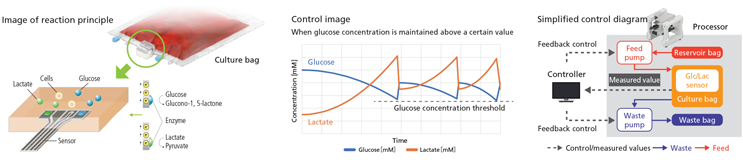 Glycolysis is one of the major energy metabolism pathways in cells. Since this process takes in glucose and produces lactate, changes in these substances are considered to be a useful indicator of the cellular state. The LiCellGrow cell expansion system is intended to not only conventionally detect pH/DO in the medium, but also measure the concentrations of glucose and lactate in real time. It is being designed to be capable of automatically replacing the culture medium based on the measured glucose and lactate values.