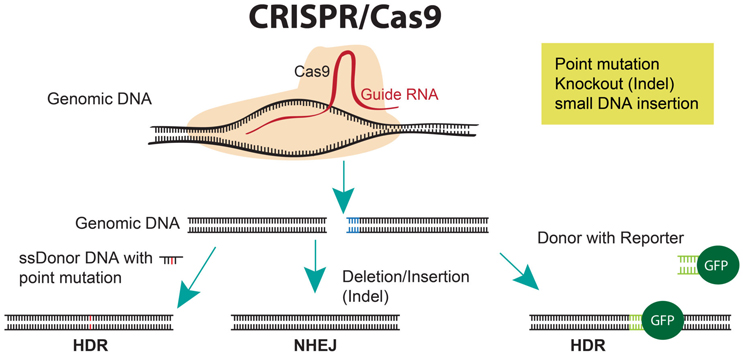 Wild-type Cas9 creates double stranded breaks in the genome that can be repaired using non-homologous end joining (NHEJ)—creating an indel (insertion/deletion)—or via homologous recombination with a donor plasmid (homology directed repair (HDR)) to create knock-ins or point mutations.