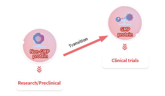 GMP-grade protein products use the same clone, sequence, and expression system as our non-GMP grade proteins and have the same performance. As such, your raw materials can be easily transitioned to GMP-grade. From our extensive catalog, we can quickly convert our existing non-GMP grade raw materials to GMP-grade.