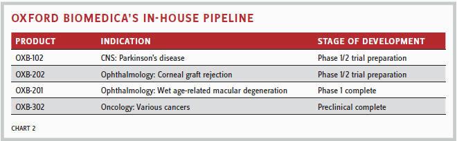 There are four products in Oxford BioMedica’s in-house pipeline (Chart 2), and the company’s business plan is to develop products to preclinical and then seek partners.