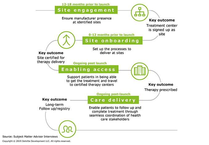 Delivering cell and gene therapy requires specialized facilities, capabilities, and clinician skills. It is, therefore, essential that a manufacturer works with its chosen treatment centers to establish the protocols and procedures necessary to receive the product and initiate therapy. Manufacturers and senior site leadership should begin engaging 12 to 18 months prior to product launch, with staff onboarding following soon after and care delivery ongoing post launch (Figure 2).