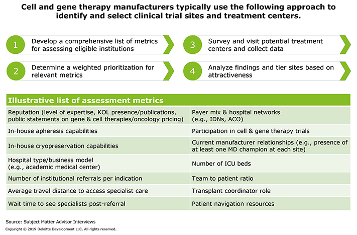 Some companies focus on institutions that have the capacity to accept patients and the necessary capabilities to deliver cell and gene therapies. Others value the reputation certain institutions have in the medical community or their vision and willingness to invest in treatment capacity to support the growth of gene and cell therapies.