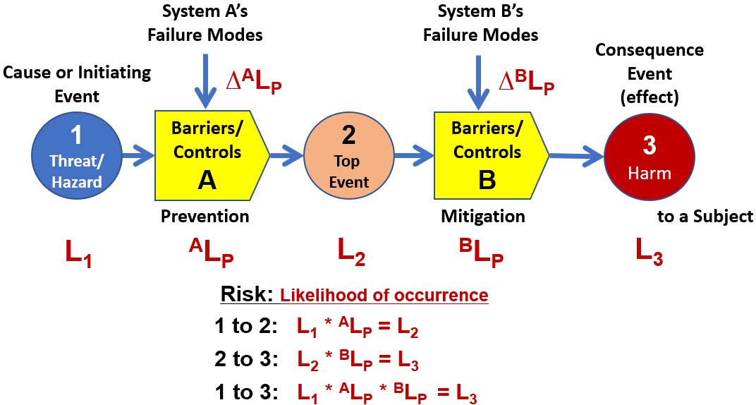 The risk shown in Figure 2 is actually two different risk relationships of the threat causing the top event and the top event causing the harm. Many very important risks have a significant intermediate event that connects the initial threat to harming a subject.
