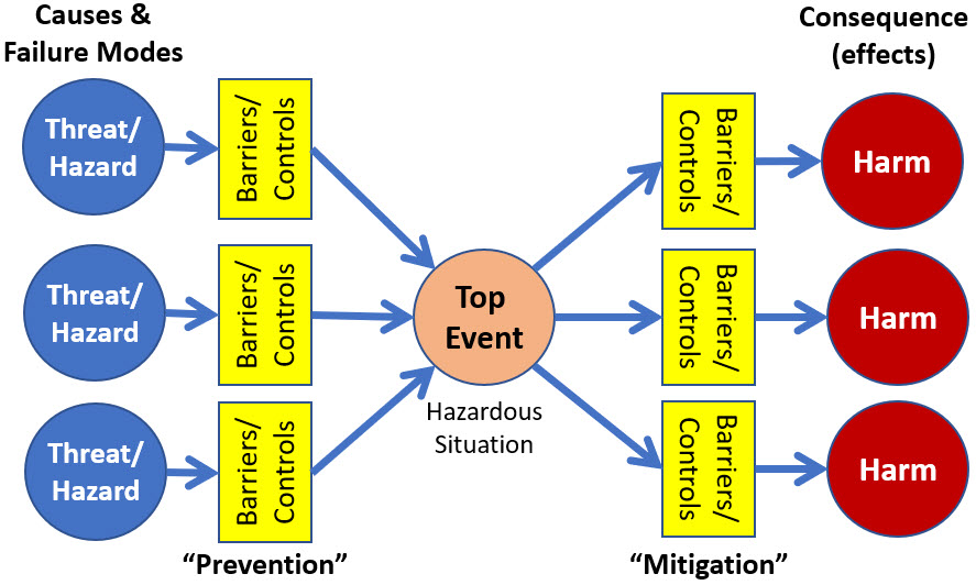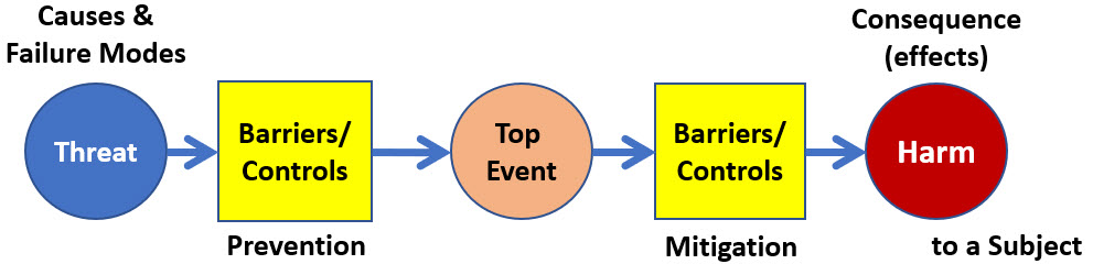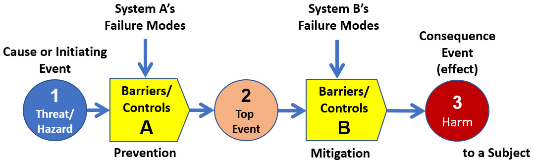 - Show the flow of threat events through preventive barriers and control “systems” to the top event followed by mitigation barriers to prevent harm to subjects.