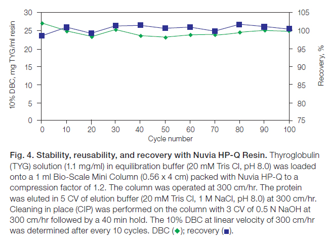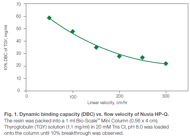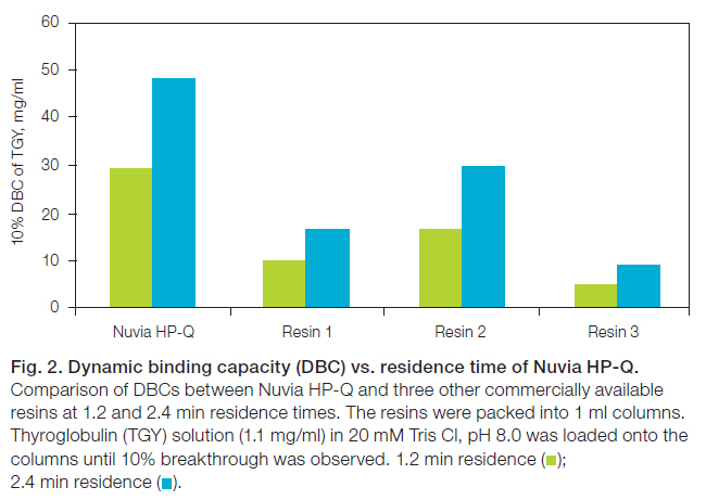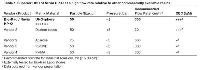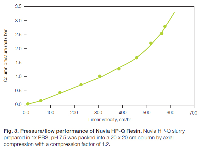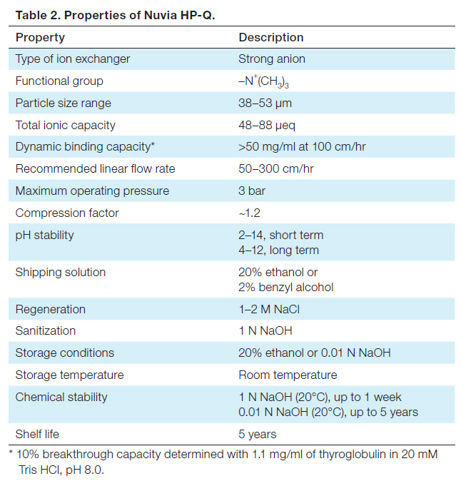 Nuvia HP-Q is a high-performance strong anion exchange resin. It is the latest product in the Nuvia family of high-capacity ion exchange resins and can be used for downstream purification of large molecules such as high molecular weight (HMW) plasma proteins IgA and IgM, viruses, virus-like particles (VLPs), and PEGylated proteins. It is built on the rugged and hydrophilic UNOsphere™ epoxide base bead that provides the fast mass transfer kinetics and low nonspecific binding demanded by today’s process manufacturing. The stability of this base bead and its broad chemical compatibility allows repeated uses with a long resin lifetime. Nuvia HP-Q particle size is designed to offer high dynamic binding capacity (DBC) at fast flow rates without excessive backpressure, thereby delivering excellent process economics.