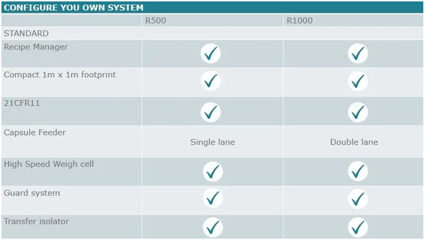 Currently available in two sizes: R500 (up to 500 capsules/hour) and R1000 (up to 1000 capsules/ hour)