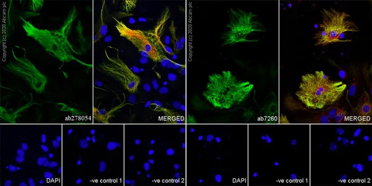 Figure 4. Immunofluorescent analysis of mouse primary neural/glia cells labeling GFAP with our recombinant anti-GFAP multiclonal antibody, ab278054 (left), against our polyclonal anti-GFAP antibody, ab7260.