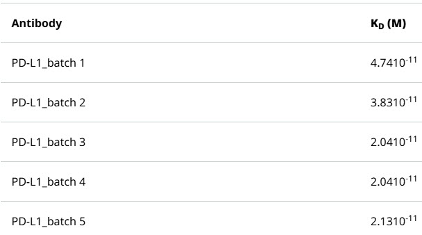 The KD value is a quantitative measure of antibody affinity. The lower the KD value, the higher the affinity of the antibody. Analysis of KD values of our recombinant anti-PDL1 antibody shows that its affinity remains high across five different batches (Table 1).