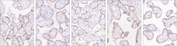 Figure 1. Batch-to-batch reproducibility in the localization of PD-L1 in FFPE human placenta across five batches of our anti-PD-L1 [28-8] recombinant rabbit monoclonal antibody (ab205921). IHC was performed manually using a Biocare Decloaking Device and Universal HIER antigen retrieval reagent (ab208572). The primary antibody was incubated overnight at 4°C, followed by goat anti-rabbit secondary antibody and HRP-linked anti-goat polymer antibody (ab209101). DAB was used as a chromogen with a Hematoxylin counterstain.
