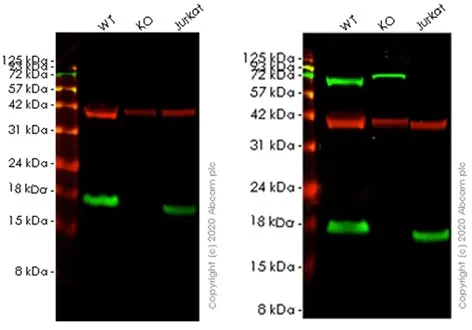 Figure 2. Our recombinant anti-GRIM19 [EPR4471(2)] (ab109017) antibody (left) being tested on knock-out and wild-type samples against our monoclonal anti-GRIM19 [6E1BH7] (ab110240) antibody.