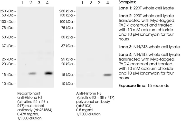 Figure 3. Our recombinant anti-Histone H3 (citrulline R2 + R8 + R17) multiclonal antibody [RM1001], ab281584 (left), tested in multiple sample types in western blot against our polyclonal anti-Histone H3 (citrulline R2 + R8 + R17) antibody, ab5103.