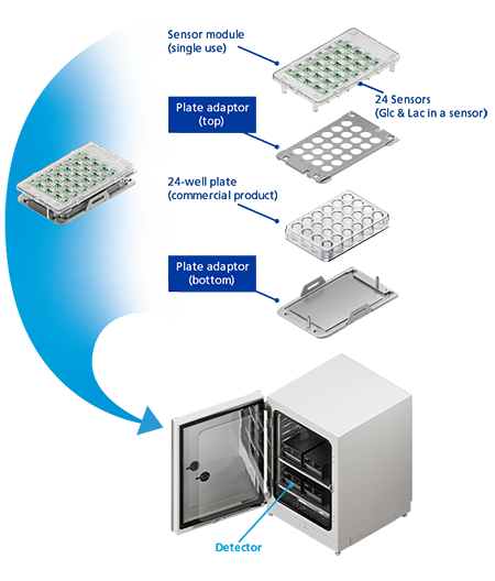 The simplicity of LiCellMo's design makes it suitable for any laboratory space and does not require specialized cell culturing equipment. Common commercial products (culture medium, 24-well plates, calibration liquid, additive reagents) can be used for cell culture. The sensor module and plate adaptor can be attached to standard 24-well plates. Once the plate is placed in the detector pre-installed in the CO2 incubator, real-time, sample-free measurements can be easily monitored using the touch-panel controller. Optional plate adapters are available for five different commercial 24-well plates.