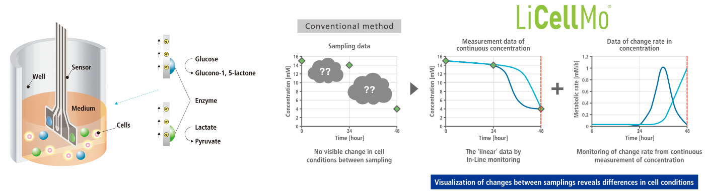 LiCellMo enables direct evaluation of changes in the glycolytic pathway by measuring glucose uptake and lactate production in the cell culture medium. It visualizes cell metabolism using consumption and production rates based on concentration values, providing valuable metabolic rate data. Monitoring the efficiency of conversion from glucose to lactate makes it possible to evaluate not only glycolysis but also the balance with other cellular metabolic processes, such as the TCA cycle and oxidative phosphorylation in mitochondria.