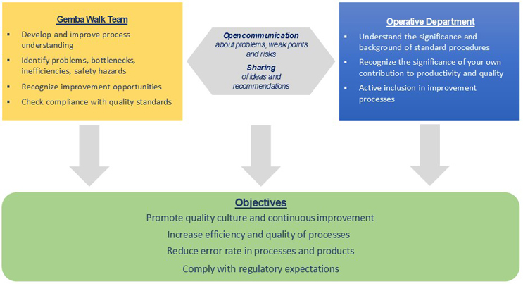 In this practical tool from lean management methods, a Gemba-walk team regularly visits operational areas such as production, laboratories, and technical spaces. Gemba walks aim to promote the quality culture and continuous improvement in the long term (see Figure 3).