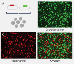 Figure 3. Integration using TARGATT technology is single copy. (A) We co-transfected GFP and mCherry TARGATT™ donor plasmids into CHO cells and imaged the resulting cells using the green channel (B), the red channel (C), and as an overlay (D). The lack of yellow cells in the overlay indicates the absence of cells expressing both GFP and mCherry, demonstrating that genomic insertion only occurs in single copy.