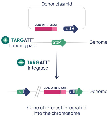 - The TARGATT™ integrase binds the attP and attB sites, mediating a site-specific recombination event that results in the stable insertion of a single copy of the donor plasmid into the genome at the attP site.