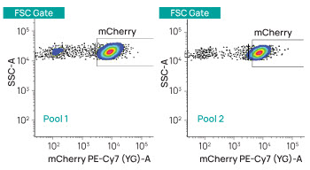 Figure 1. TARGATT™ technology delivers efficient integration with consistent expression. We inserted mCherry into the TARGATT™ landing pad at the H11 safe harbor site in HEK293 cells and used flow cytometry to assess mCherry expression in two different pools of integrants.