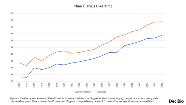 Significantly more research is necessary to uncover a better understanding of women’s unique biology critical to laying the groundwork for true precision medicine in the future. Given gender-specific pharmacodynamics/pharmocokinetic differences and a historic lack of representation in clinical trials, there is an unmet need for safety and efficacy data on treatments for women. Safe, effective treatments could be achieved by gaining a better understanding of these differences, along with targeted recruitment strategies and specific eligibility criteria to ensure equitable participation. Research in women’s health is improving, with publications nearly tripling and clinical trials increasing tenfold over the last 20 years (Figures 1 and 2). While precision medicine in women’s health may be decades behind oncology, this uptick in research is likely to soon lead to innovative transformation.