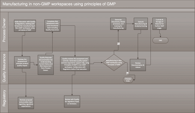 First, it is significant to understand the rationale for manufacturing or processing material in a non-GMP workspace while following the principles of GMP. This shall be assessed based on an understanding of how the material will be used and the regulatory strategy governing the overall program. One can ask the project owner the following questions: