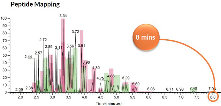 Significantly reduce analysis time compared to traditional methods. ZipChip can perform analyses in minutes, whereas a traditional capillary electrophoresis instrument or liquid chromatography (LC) methods might take much longer. This rapid turnaround is crucial for timely decision-making in research and manufacturing processes. The image above shows peptide mapping of the NIST mAb, with analysis done on the ZipChip in under 8 minutes. This could take hours on an LC MS system.